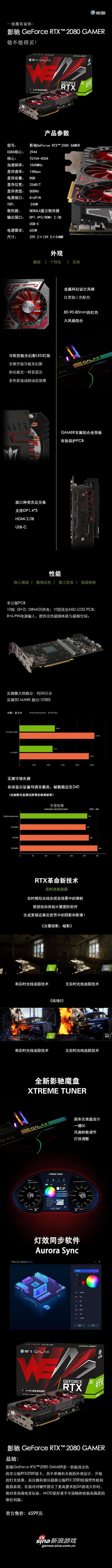影驰GeForce RTX™ 2080 GAMER是一款极其出色的非公版RTX2080显卡,其不单拥有全新的外观设计、升级的灯光效果,而且拥有部分超越公版RTX2080的强悍性能和散热表现,在面对对硬件提出了更高要求的3A游戏大作时,绝对是高端电竞玩家、MOD爱好者手中流畅体验极高画质的绝佳利器。