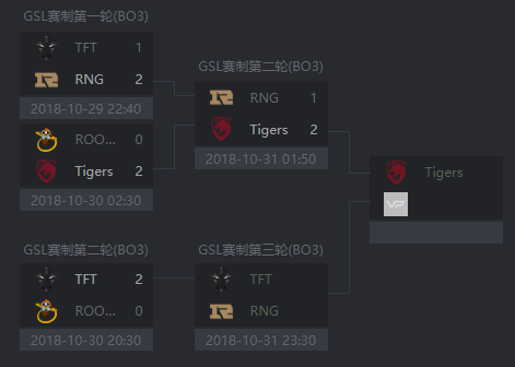 说完RNG打小老虎,再来看看其他三场BO3中发生的事件。其中,TFT把昨天RNG用来打他们的TB毒狗用在了ROOONS的身上。尽管这对组合打起来感觉不是很熟练,但ROOONS却是一个绝佳的练习对象。看到TFT以2:0的比分拿下ROOONS,观众不禁为RNG捏一把汗。明天的比赛,RNG能否再度闯过TFT这关?就让我们拭目以待。