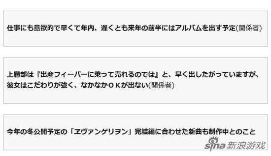 不过今天日本著名八卦杂志《周刊文春》爆料,宇多田光目前正在创作新曲,这首曲子将会在2015年冬季上映的EVA新剧场版最终章中使用,专辑最快年内最晚明年上半年推出。