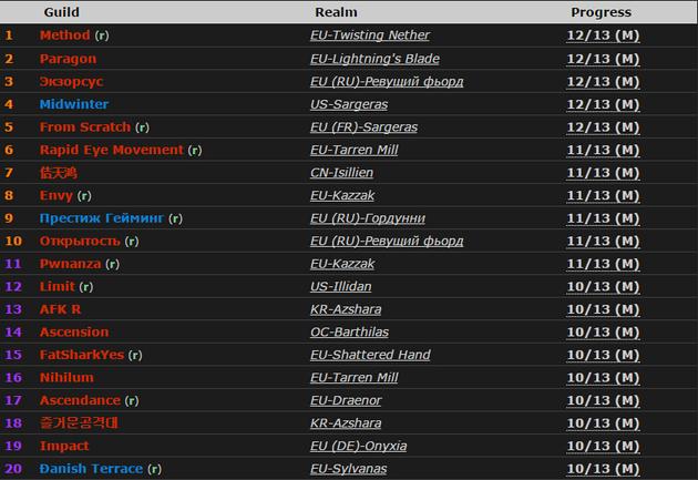 截止北京时间10点,共有10家公会达到11/13以上,其中5家12/13,分别是Method(欧服英语区)、 Paragon(欧服英语区,芬兰)、Exorsus(欧服俄语区)、Midwinter(美服)、From Scratch(欧服法语区);5家11/13,分别是Rapid Eye Movement(欧服英语区)、佶天鸿(国服)、Envy(欧服英语区)、Prestige Gaming(欧服俄语区)、Openness(欧服俄语区)。