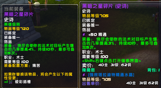接着以LZ的装备来对比一下有这个饰品和没这个饰品最直观的差距(以720黑暗之星碎片为例,以下简称黑星):