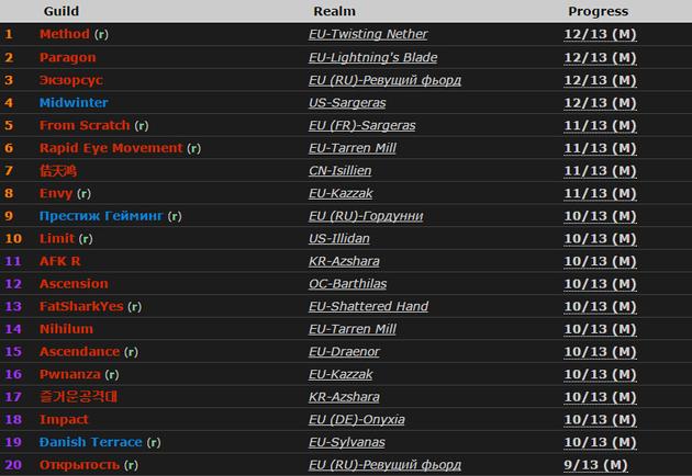 今天中午Midwinter顺利杀玛诺洛斯,与Method、Paragon和Exorsus共同组成了第一集团,而Method与Paragon目前还没有传来经过确认的阿克蒙德消息;Envy击杀暴君后,成功晋升为第二集团,目前11M的公会共有4家,分别是欧服的Rapid Eye Movement和Envy,欧服法语区的From Scratch以及国服的佶天鸿,昨日曾有消息称From Scratch距离击杀玛诺洛斯非常近,但经历副本BUG后的他们似乎又经历了主力频繁掉线的情况,目前还没有击杀;达到10M的公会共有11家。