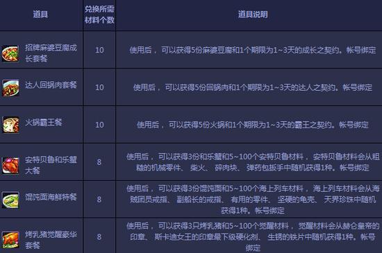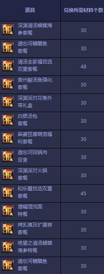 活动期间,勇士们可以在每日18:00-22 : 00出现在暗黑城的NPC神秘大厨处利用【食材箱】兑换以下奖励道具!