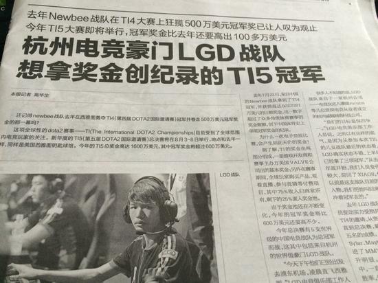 7月21日,《钱江晚报》刊登了一篇题为《杭州电竞豪门LGD战队想拿奖金创纪录的TI5冠军》的文章,在这篇本应是介绍LGD刀塔战队出征第五届DOTA2国际邀请赛的新闻中,竟然出现了LGD英雄联盟队员的身影。