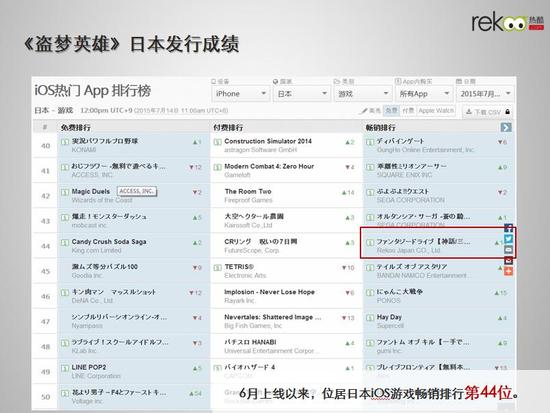 之所以热酷有自信进军海外市场,与海外取得的成绩是分不开的。以近期热酷旗下发行的《Fantasy Drive》为例(国内名《盗梦英雄》,日本地区命名《ファンタジードライブ》。游戏于5月27日在日本上线,能够在上线后48小时之内,就积累了近6万玩家,转化率高达80%。近日,日本权威游戏媒体Social Game Info宣布,《Fantasy Drive》强势闯入日本iOS与Google Play两个畅销榜TOP50,位居日本iOS游戏畅销榜第44位、免费榜第3位以及Google Play畅销榜第43位,创下了今年中国手游在日本的最好成绩。
