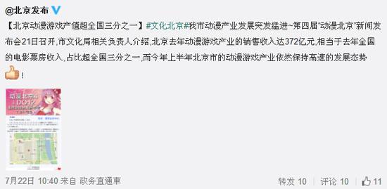 “北京去年动漫游戏产业的销售收入高达372亿元,相当于去年全国的电影票房收入,占比超全国三分之一,而今年上半年北京市的动漫游戏产业依然保持高速的发展态势!”昨天,在第四届“动漫北京”新闻发布会上,北京市文化局副局长关宇公布了上述数据。
