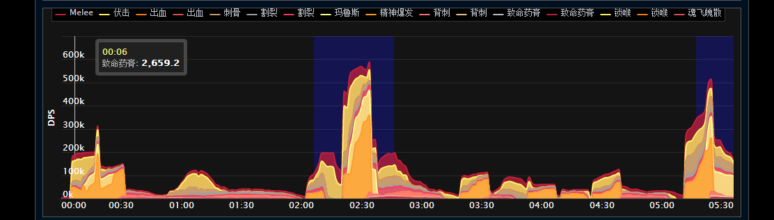 dps曲线,可以看出dps主要集中在爆发阶段,而平缓输出期的dps非常低。