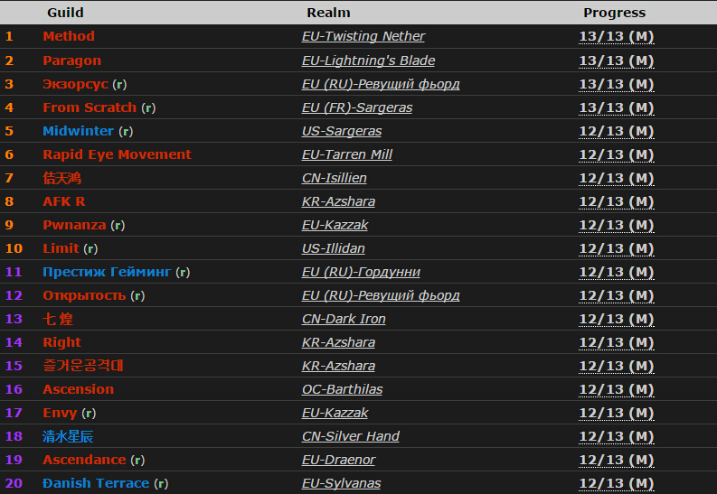 - 2点27分,KinRaiders亚洲第五击杀玛诺洛斯,12/13。至此韩服已经有3个公会达到12/13,与欧服俄语区并列国家队第一。