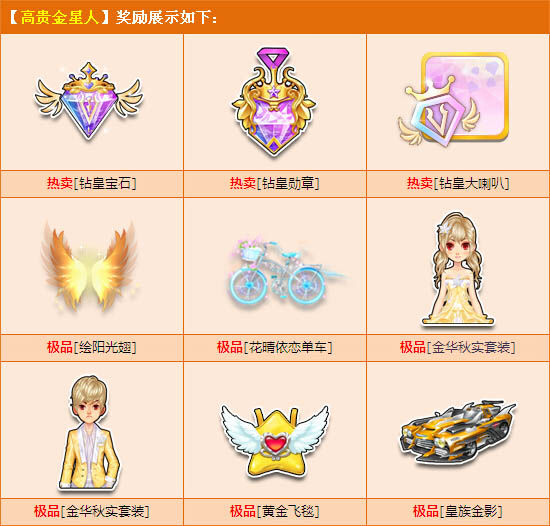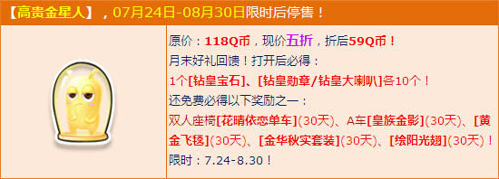 7月24日-8月30日,【高贵金星人】月末超值回馈,原价118Q币,现价五折,仅售59Q币,打开后必得1个【钻皇宝石】、【钻皇勋章/钻皇大喇叭】各10个、以及【双人座椅花晴依恋单车】、A车【皇族金影】、【黄金飞毯】、【金华秋实套装】、【绘阳光翅】30天或其他奖励之一!