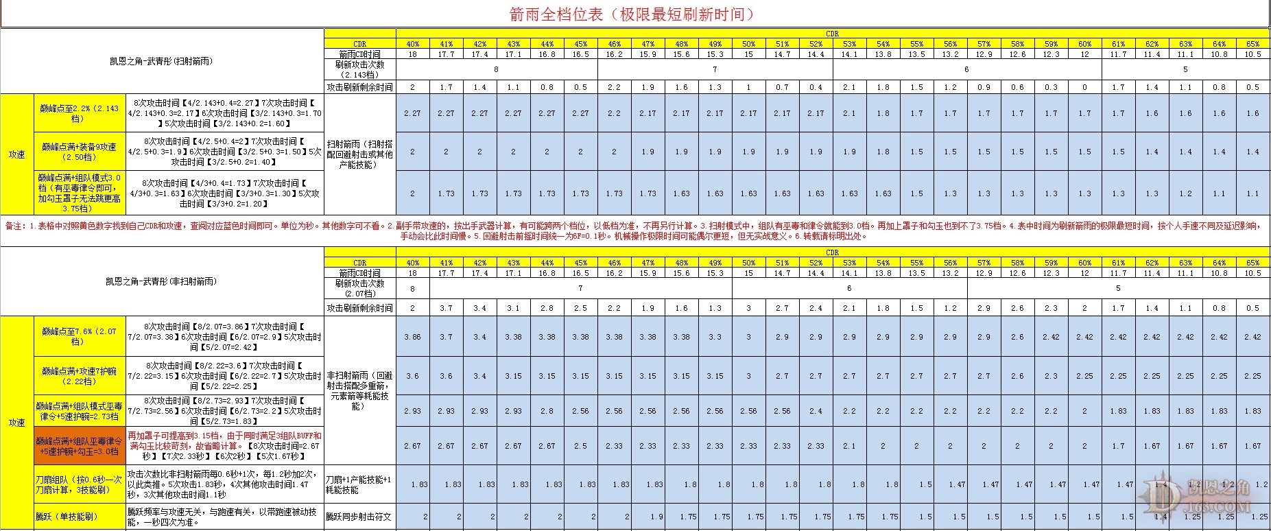 从got6666的攻速表,和我的箭雨档位表中可以看出。一个46%CDR循环中,点2.2攻速巅峰,刷新箭雨时间比不点2.2巅峰快0.26秒。这个0.26秒是最大收益。依据不同人手速变化,收益会降低。