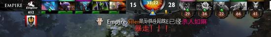 1 今天早上结束的Empire和CDEC的第二局比赛中,Empire的拉比克偷到女王大招,配合上剑圣的高爆发团灭了CDEC。Silent的剑圣拿到了本届TI的第一个暴走。
