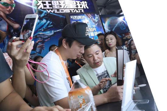 循着一声声的“老公”声望去,才知道是国民老公王思聪来了,他的现身引起了巨人展台现场的一阵骚动,“老公”不仅在巨人副总裁彭程的陪同下参观了整个展台,更是在现场进行了巨人游戏的试玩哦。