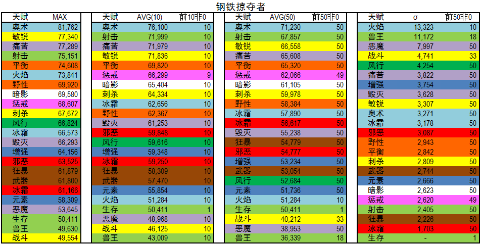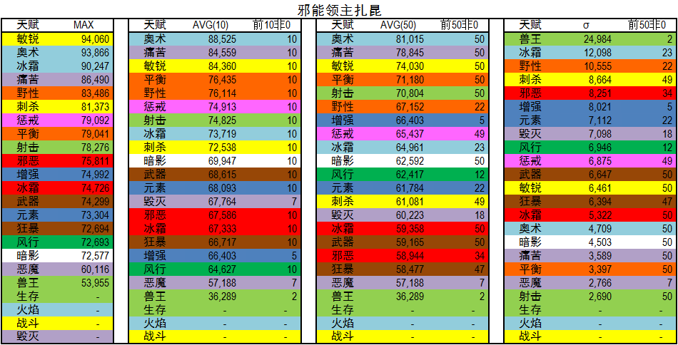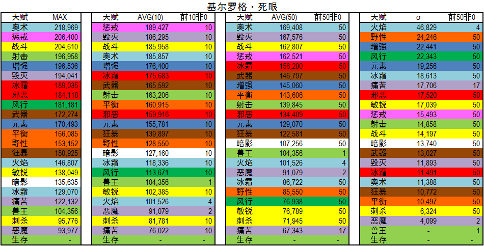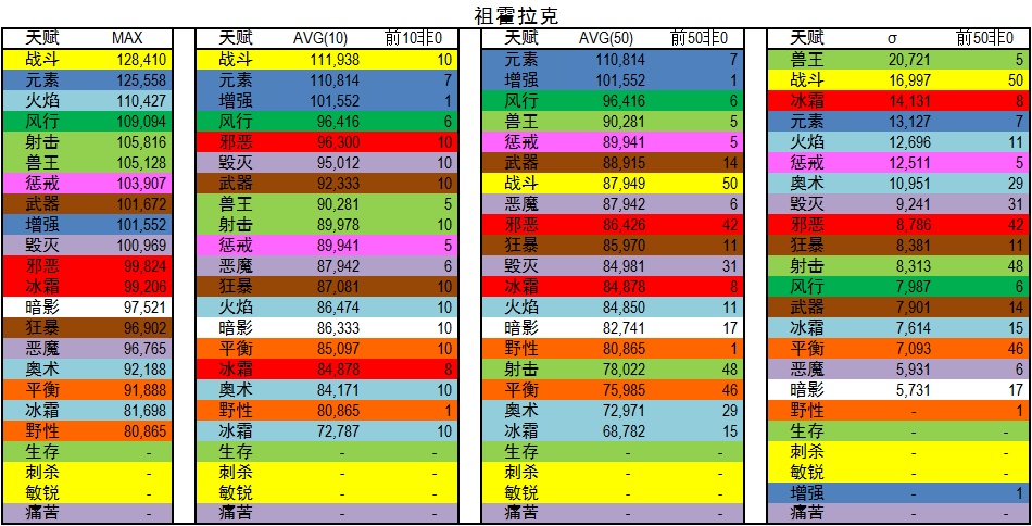 σ :前五十标准差,该值越大代表该专精在该BOSS越难以掌握或者说明该专精在该BOSS上下限差别很大。值得说明的是,很多专精由于上传人数不足50,所以σ并不可靠,在上传人数大于50的专精中,比较有参考价值。