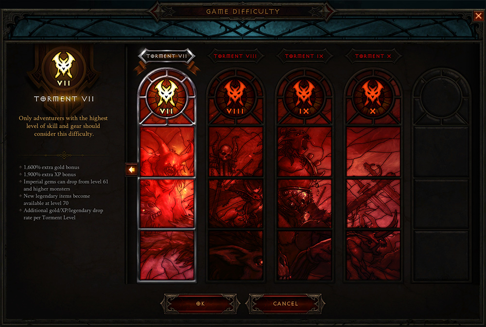 因为玩家不断的发现强力的新装备,当前的最高难度—折磨VI—变得没什么挑战了。为了保障身经百战的老兵保持警觉,我们添加了4个有着合适奖励率的折磨难度,包括折磨X。我们会在PTR测试过程中反复测试这些新难度和奖励,所以我们期待您的反馈!