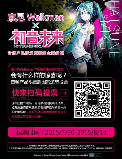 今年7月30日,由索尼中国开展的“索尼初音未来限量版音频产品全民投票活动”正式启动:即日起至8月14日,通过扫描活动海报中的二维码,即可参与投票。