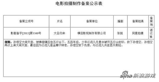 电影拍摄制作备案公示表显示,该片片名和动画一样为《大圣归来》,由横店影视制作有限公司出品。