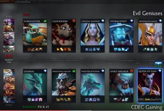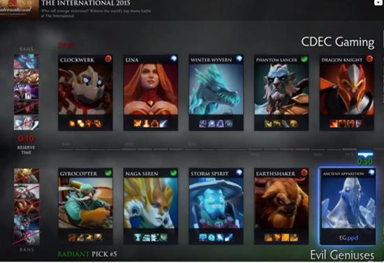 在我开始分析bp之前要说明的是我们和CDEC在小组赛前就有训练过,甚至小组赛打完后我们唯一训练过的队就是CDEC。(小编注:EG在本次TI5上喜欢搞神秘,不接队训练、媒体采访室也不去、小组赛期间在酒店很少露面,但阴差阳错的和外卡赛队伍练了一局,好死不死的就是总决赛对手CDEC。血崩!)