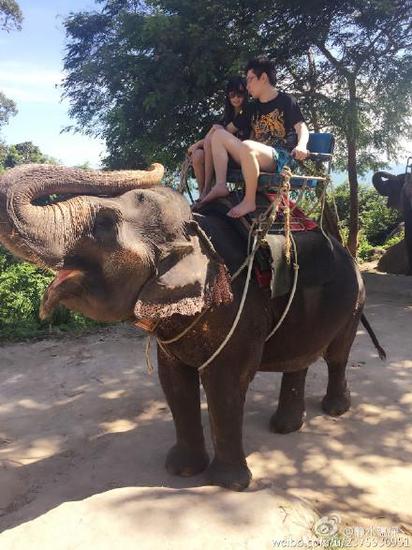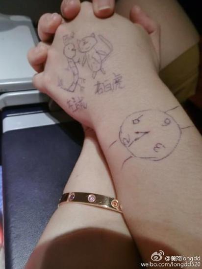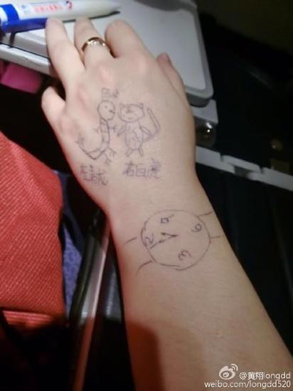 黄翔longdd:终于到了,二货老婆在飞机上给我画了满手纹身,这几天好好放松放松。。今天去骑了大象感觉棒棒棒