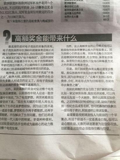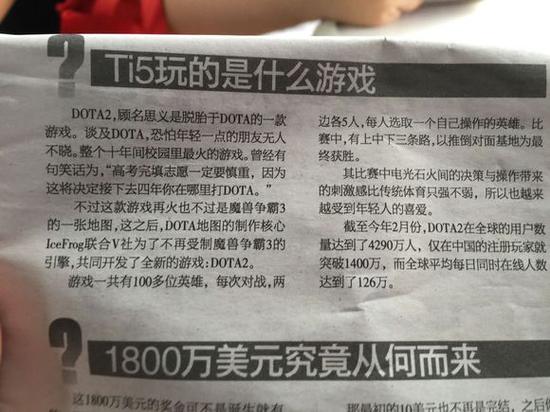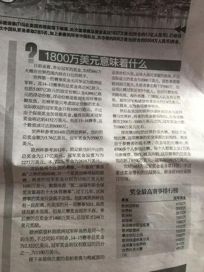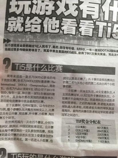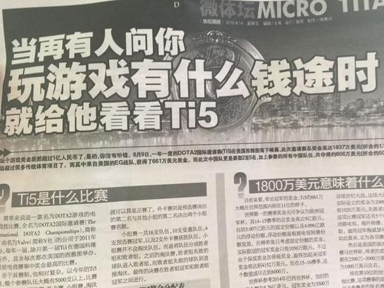传统体媒《体坛周报》整版报道DOTA2 TI5