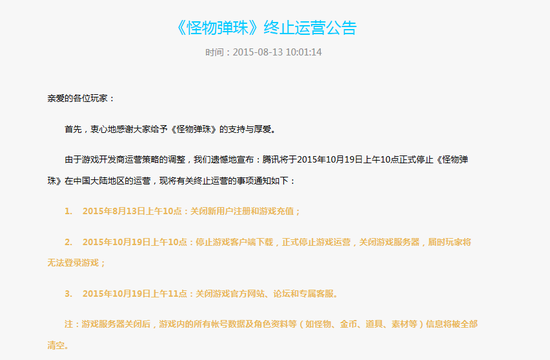 今天上午10时,腾讯发布了《怪物弹珠》国服停止运营公告。公告中指出“由于游戏开发商运营策略的调整,我们遗憾地宣布:腾讯将于2015年10月19日上午10点正式停止《怪物弹珠》在中国大陆地区的运营。”在游戏相关贴吧上,有玩家对此举表示不解,并有玩家指出,游戏在8月7号还在更新版本,突然宣布停止运营,让人有些意外。