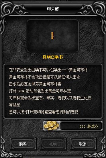 【怪物召唤书】购买位置:安全区内按“X”打开在线商铺,选择消耗累第一页右上角。要求点数225点。