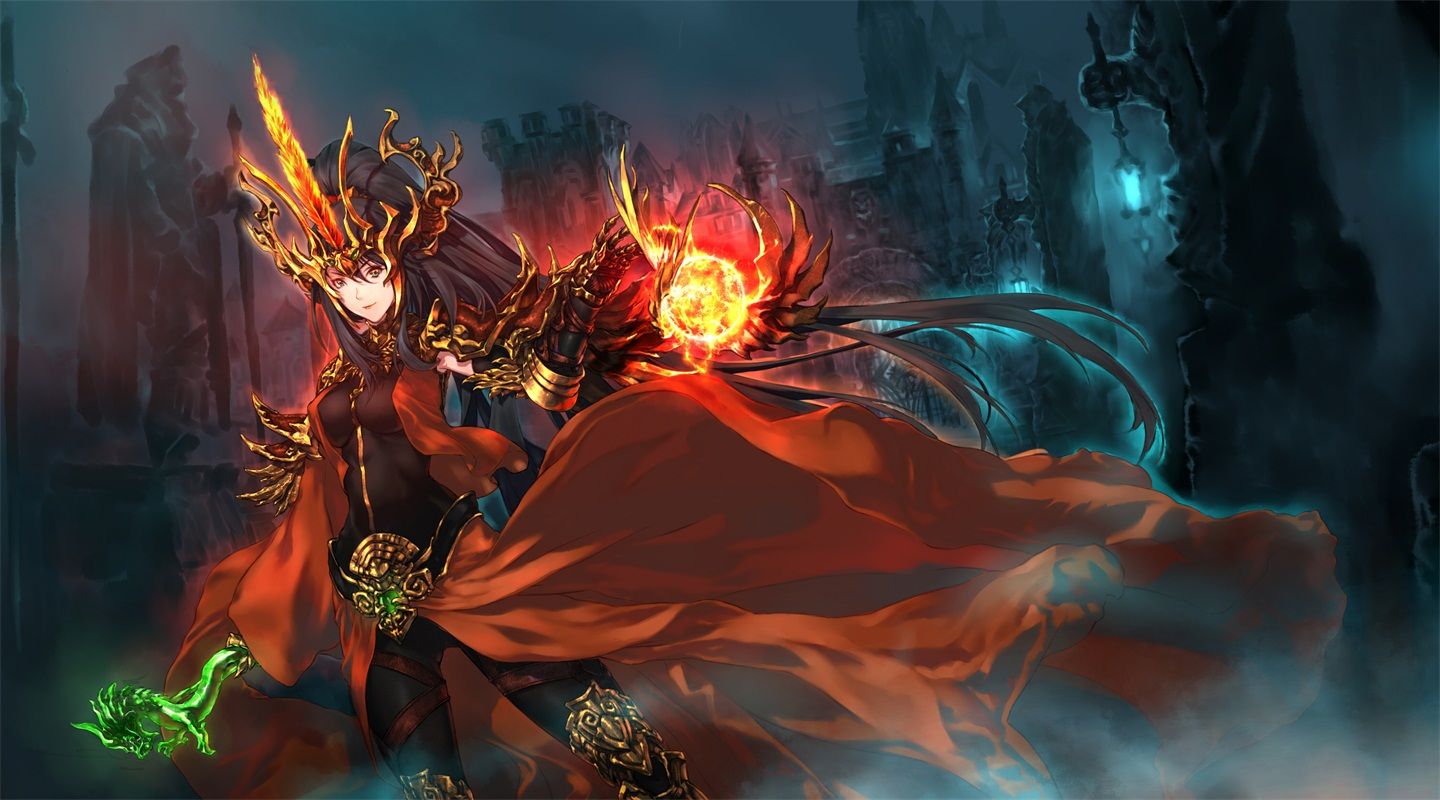 画中描绘了在幽暗之都卫斯马屈城中,魔法师手拿妖蛇之牙,身着不死鸟套装,仿佛一只熊熊燃烧的凤凰,要焚尽一切敌人。
