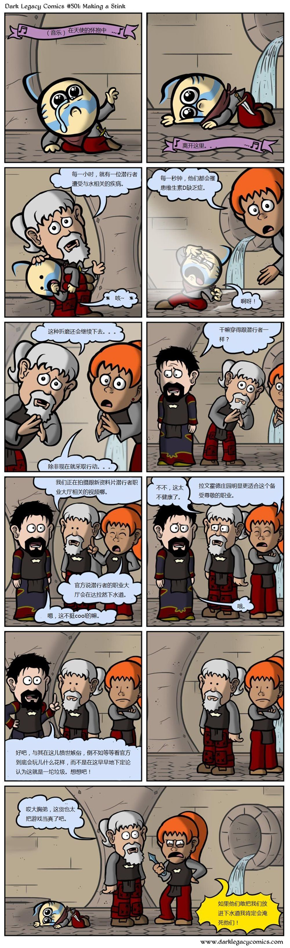 近期有玩家在推特上向官方抱怨说7.0盗贼的职业大厅不应该是下水道而是拉文霍德,于是darklegacycomics就根据这则蓝推创作了这期的漫画。