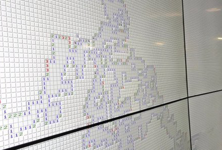 不过下面这款扫雷相比起电脑里的初级中级高级,难的不是一点点。一家名为 CineMassive的亚特兰大公司最近开发了世界上有史以来最大版本的扫雷。这个魔王级别的扫雷需要用24块屏幕拼凑而成的大屏幕进行游戏,玩家需要共扫掉38799个雷,才能完成游戏。中间只要错一次,就需要你从头再来。