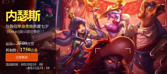 七夕将至,在这个充满爱的日子,情人节限定皮肤——“觅心女王 艾希”也将限时上架。同时,“单身贵族 内瑟斯”将会限时半价销售。