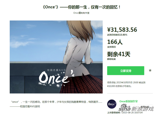 新浪游戏讯 国产恋爱AVG《Once》在摩点网上开启众筹。近日,该作的众筹资金已突破3万,达到目标的315.80%。