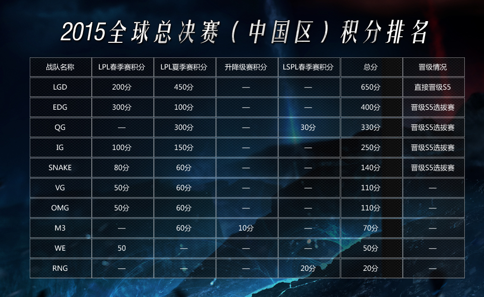 《英雄联盟》四周年狂欢盛典2015全球总决赛中国区代表队选拔赛将会是今年四周年狂欢盛典的重头戏之一,在今年庆典现场,EDG、QG、IG、SNAKE四支战队将角逐 中国大陆赛区参加全球总决赛的剩余2个名额!选拔赛会在9月4日、9月5日两天举行,采取双败淘汰制,每天都会决出一支战队晋级2015全球总决赛!