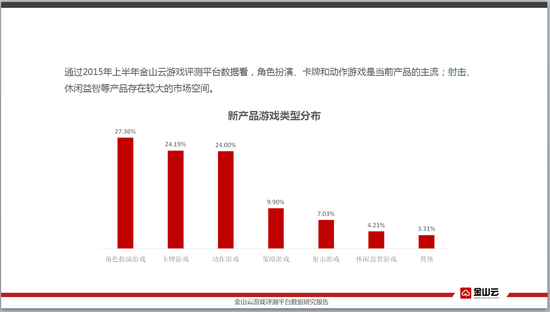 根据报告中数据显示,在最新产品中,角色扮演类手游占总体的27.36%;卡牌类手游占总体的24.19%;动作类手游占总体的24%。三大主要类型手游占总体份额超过了75%,这三类依然是主流。