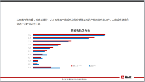 随着各大巨头的加入以及手游IP战略,囤积了大量优秀人才的北上广为代表的一线城市开发优秀产品的优势越来越明显,二线城市研发商的测试产品数量明显下降,教育基础好、人才密集的一线城市及部分孵化基地的产品数量明显上升。