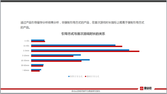 通过上图可以看出,非强制引导更适合目前的主流引导方式,强制引导用户流失比例更高,同时引导时间在3分钟内时达到最高峰,超过3分钟流失比例明显大幅增加,所以非强制引导并且时间在3分钟内的产品最容易获得大量留存。