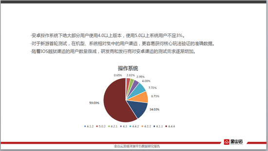 97%以上的玩家都在使用4.0以上的版本,5.0用户非常稀少。对于新游首轮测试,在机型、系统相对集中的用户渠道更容易获得核心玩法验证的准确数据。随着IOS越狱渠道的用户数量骤减,研发商和发行商对安卓渠道的测试需求逐渐增加。