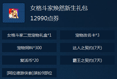 开启后, 可以从4种女格斗家二次觉醒宠物中选择1种获得。 此礼盒只能由女格斗家开启, 获得的宠物无法交易。礼盒为账号绑定。