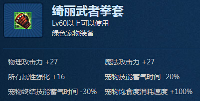 开启后, 可以获得超强绿色宠物装备[绮丽武者拳套]。 此礼盒为账号绑定, 并且获得的宠物装备无法交易。