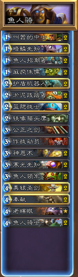 总之,因此我开发了这套卡组,打法非常简单明了,就是快攻+铺场,6费时丢上鱼人骑士时如果你场上的鱼人还没死光,那么基本上就赢了一大半了,要是那会儿你还挂着公正的话。。。真是太可怕了!