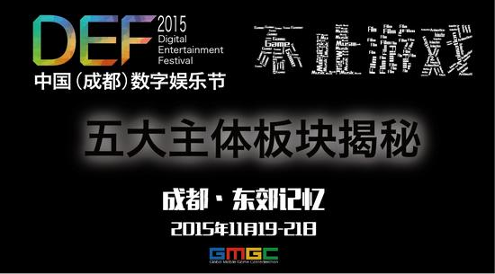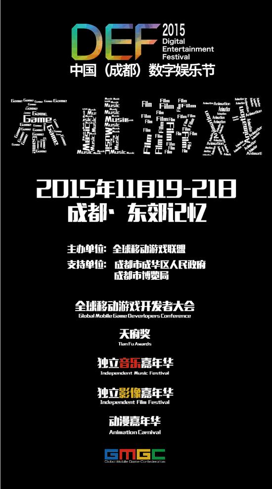 由全球移动游戏联盟(GMGC)主办、成都市成华区人民政府、成都市博览局鼎力支持的中国(成都)数字娱乐节(Digital Entertainment Festival简称:DEF2015)将于2015年11月19日至21日在成都东郊记忆举办。