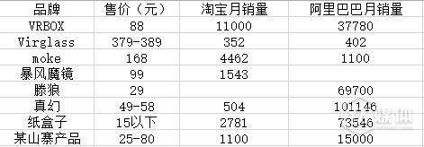 综合来看,在国内的消费级市场上,眼镜盒子是当一不二的主流产品。而眼镜盒子之所以火爆,最大推动因素莫过于价格。从各初创公司的众筹产品来看,这些眼镜盒子的售价普遍在300元以下,暴风魔镜等产品甚至把价格飙到了百元以下,不过价格更低的还有活跃在淘宝上的山寨产品。一位VR眼镜销售人员为笔者提供了部分产品在淘宝和阿里巴巴上的销售数据,笔者整理如下: