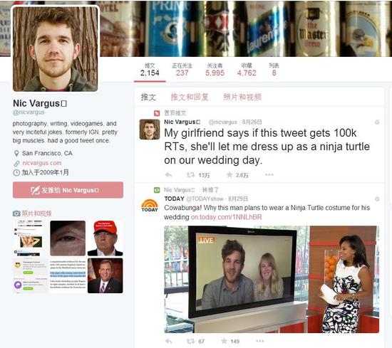 在社交网站上发消息前一定要再三考虑。据法国《20分钟报》8月31日报道,日前,美国旧金山27岁小伙尼克瓦古斯(Nic Vargus)在推特上发布一条消息:“我女朋友说如果这条状态被转发超过10万次,她就答应让我在婚礼上扮演忍者神龟。”到目前为止,这条状态的转发量已超过12.5万。