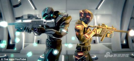 在游戏中,玩家头戴虚拟现实头罩,身着高科技服装,装备一把虚拟枪械,一边行走在四壁装有传感器的“真实世界”仓库中,一边在复杂的想像世界中历险。