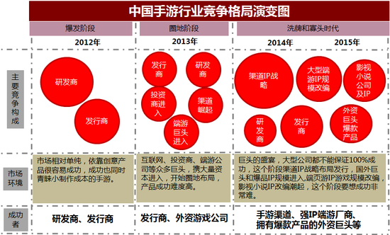 此时,大型端游公司全面发力,《全民奇迹》、《天龙八部》、《征途》等走上手机。到了2015年IP势头更加强劲,国内外知名IP游戏、影视、小说纷纷改编手游,如《炉石传说》、《爸爸去哪了》、《武媚娘传奇》。而此时,市场由手游渠道、端游公司、影视公司、外资巨头等构成,环境进入最复杂期,即便有IP也很难确保一定成功,渠道拥有更多的主动权。