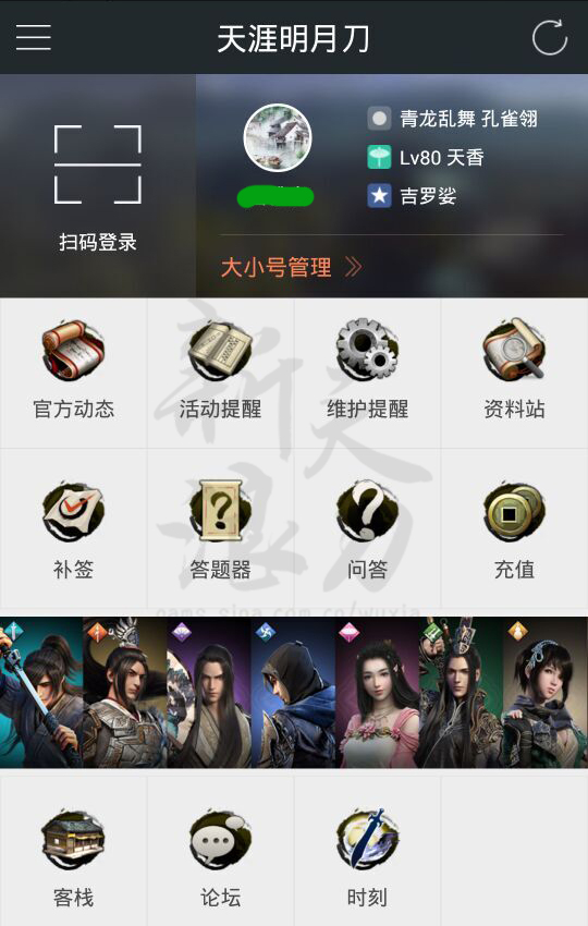 除了补签功能,APP还有答题器(新浪天刀在线答题器)、游戏时间查询、维护提醒、游戏问答、攻略查询等多种功能。