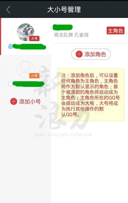 可以先绑定一个角色为大号,然后其他账号的角色添加为小号,用大号就可以管理自己所有的游戏角色了。