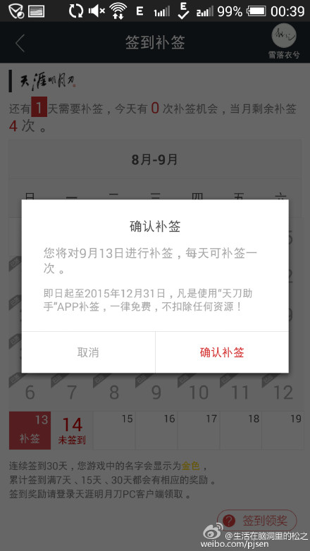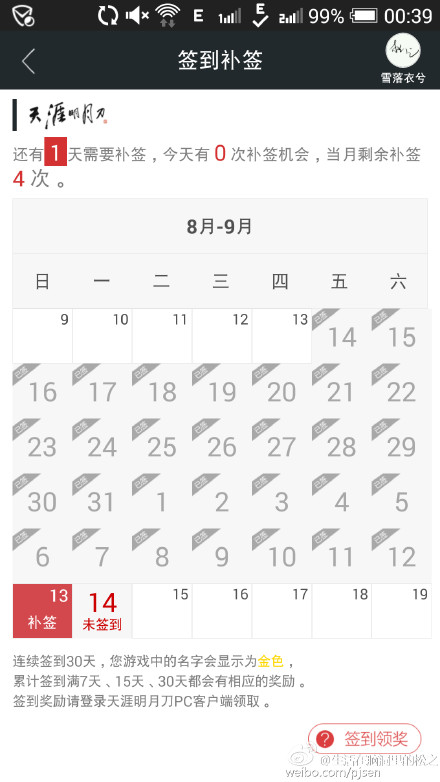 虽然官方对外公布补签APP会随10月论剑S1赛季及新资料片上线【相关阅读: 重磅消息 天涯明月刀论剑S1赛季即将开启】,但是细心的玩家发现,事实上这个功能已经偷偷上线了!