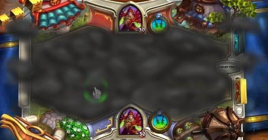 如图,所有的场地都被厚雾覆盖,并且会打乱双方各自随从的位置,这个效果只持续一个回合。当你将鼠标移到一个随从上时,你有一点点机会听到该随从的音效 (攻击或登场的声音)。当你的鼠标移到塔莉亚上时,你100%会听到音效。但你的对手移到塔莉亚身上时,他/她什么都听不见。你的对手可以通过这种方式分 辨随从都在那里。随从身上绿色的可攻击光圈以及烧绳子会透过厚雾。这只对你的对手有害,因为到你的回合开始时,一切又清晰了。