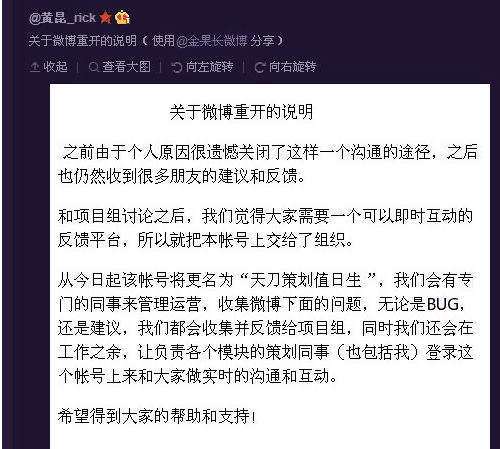 上次关博事件后,天刀策划黄昆微博在昨日重开,将更名天刀策划值日生,由天刀项目组专门派人维护,大家又可以零距离的和天刀策划实时交流了,一起来看看吧!