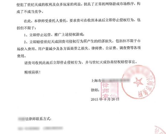 在世纪天成的维权中,一方面要求立即停止运营、推广上述侵权游戏。另一方面要求索赔因维权产生的经济损失,包括但不限于市场投入费用、用户量减少及各方面商誉之损失、律师费、公证费、调查费等。