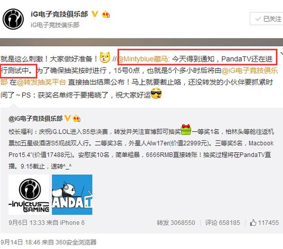 为了庆祝iG《英雄联盟》分部进入S5,iG官博于9月6日举行了一场王思聪钦定的抽奖活动。由于该抽奖活动将在新开通的熊猫TV进行直播,9月15日的抽奖日也被认为是熊猫TV最晚的上线日期。